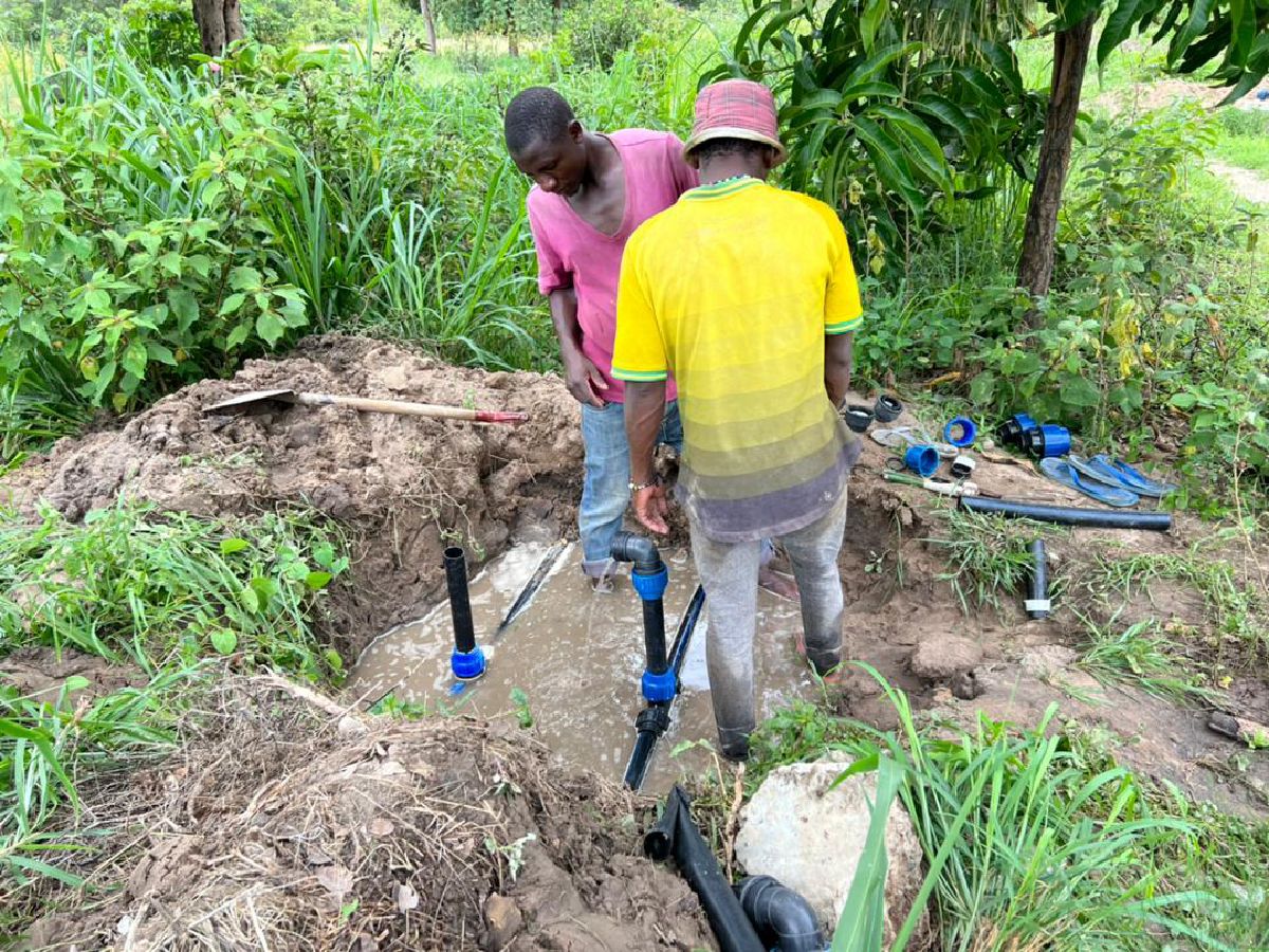 Das Betonbecken des Wasserturms ist inzwischen mit Wasser gefüllt und die Wasser-leitungen auf dem Farmgelände wurden ergänzt. Dadurch kann das Wasser mit großem Druck zu den Verwendungsorten geleitet werden.